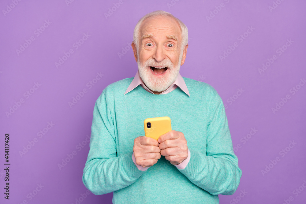 Photo portrait of senior man using cellphone amazed staring cheerfully isolated on pastel violet color background