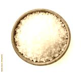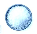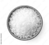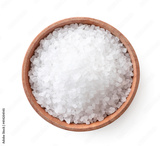 Salt crystals in a wooden plate on a white background. Top view