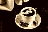 White cup of coffee on a saucer with coffee beans and marshmallows. Espresso. Close-up.