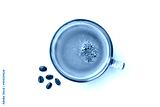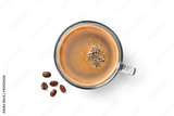 Top view of glass cup of espresso coffee and coffee beans isolated on white background