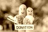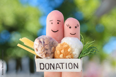 Fingers art of couple. Man and woman holding donation box with food.