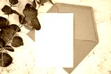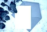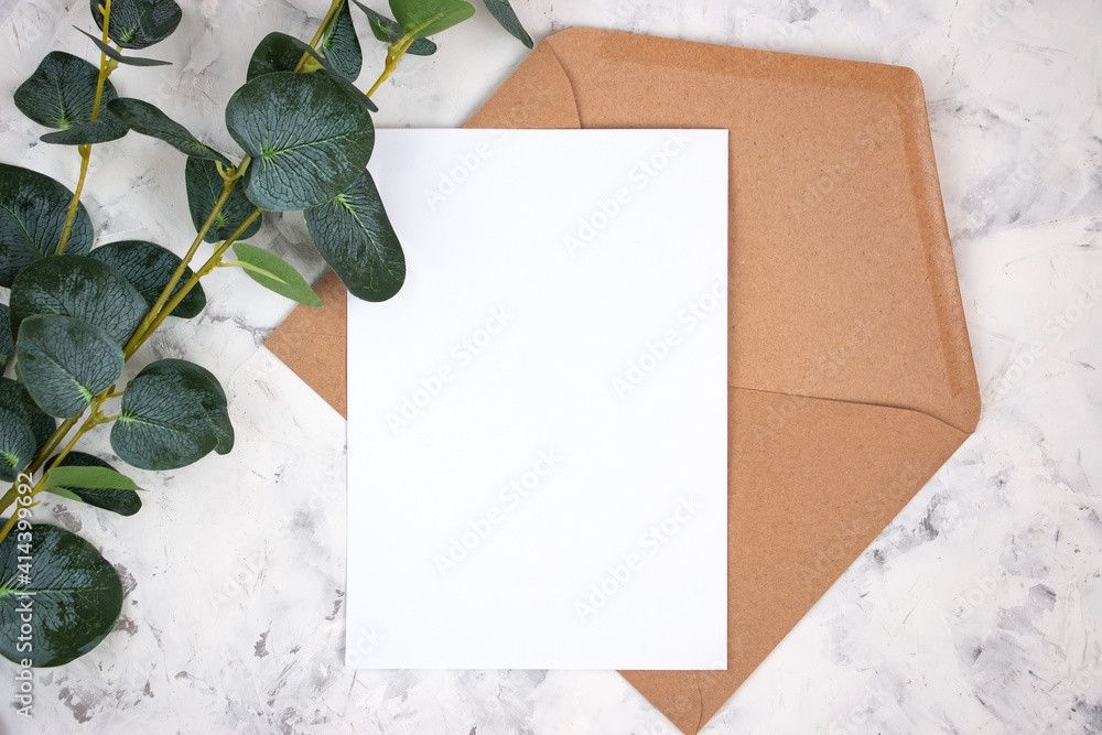 Blank white card, envelope and eucalyptus branch on white marble background. Blank invitation. Flat lay.