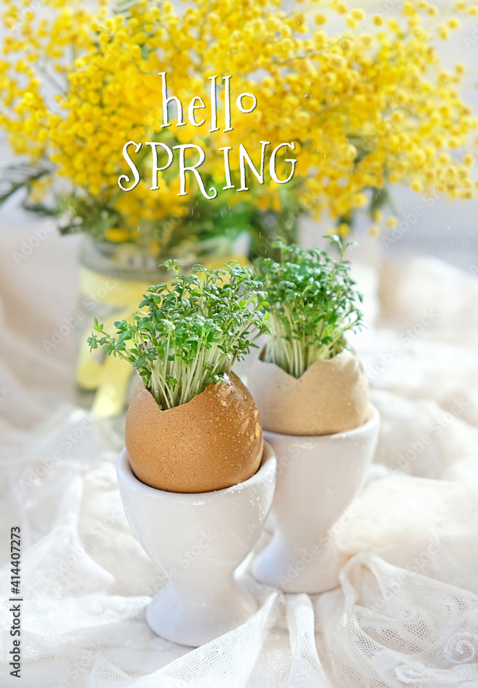 Hello Spring. green cress salad in eggshell. Fresh sprouts and mimosa flowers decorated festive Easter table.