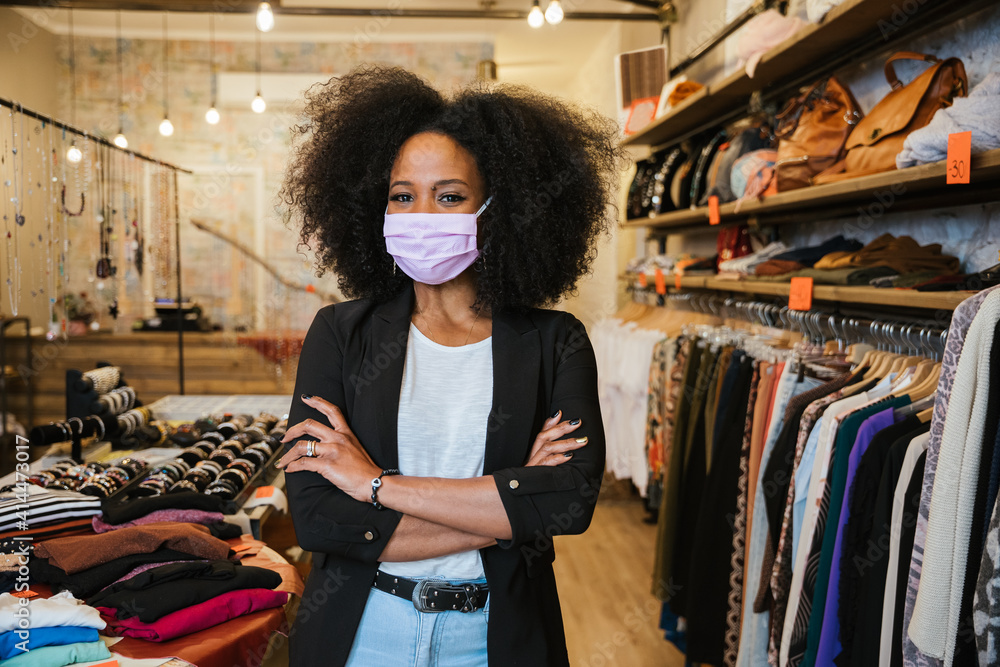 Portrait of a beautiful female sales assistant at the entrance of the business with her arms folded - Self-confident millennial owner starts a new business during the Coronavirus Covid-19 pandemic