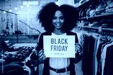 Portrait beautiful young clothing store sales assistant holding "Black friday super sale" sign at business entrance with smile - Owner millennial in shop promotes products and advertises new business