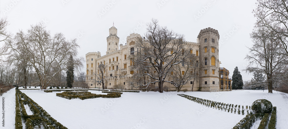 Beautiful renaissance castle Hluboka in the Czech Republic, South Bohemia region near České Budějovice town. Winter Christmas time. Castle was founded in 13th century. One of the most popular place.