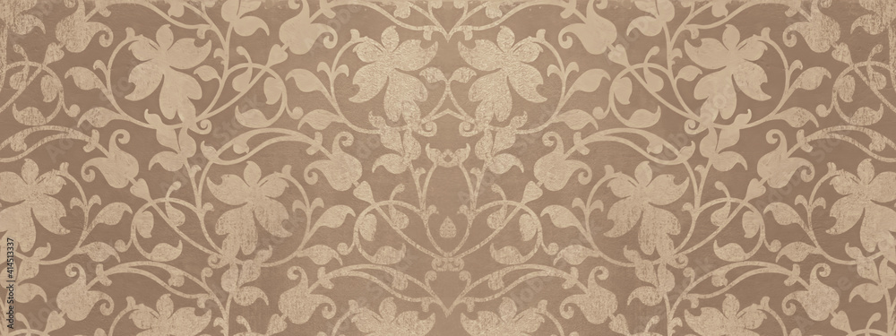 Old brown beige vintage grunge shabby damask floral flower leaf patchwork tiles stone concrete cement wallwallpaer texture background banner panorama