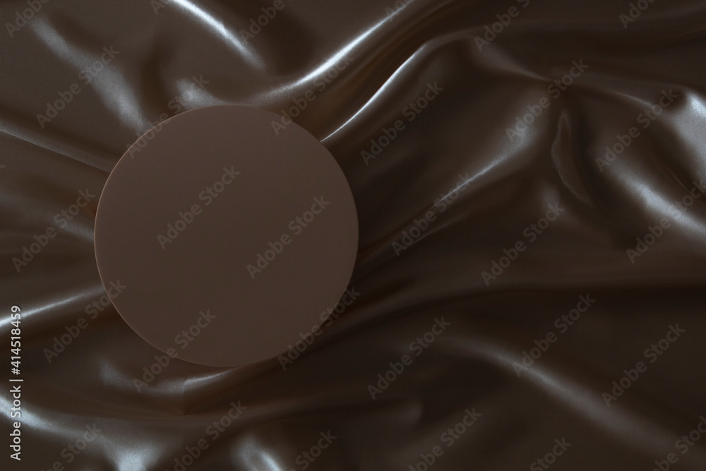 Geometric platform podium on brown silk satin background. Blank minimal cylinder form mock up background for cosmetic product presentation