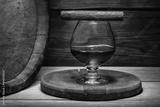 Glass of cognac stands on wooden stand made of oak on glass on top of Havana cigar lies in light rays on blurred background in boke. Cognac glass background.