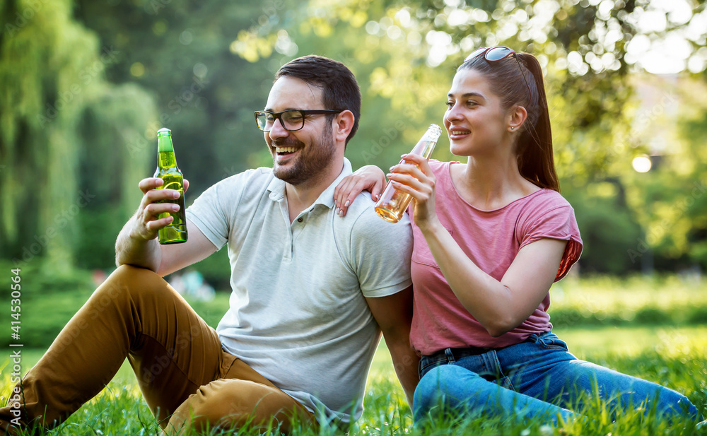 Picnic. Beautiful young couple having fun in the park. Lifestyle, dating, love and relationships concept