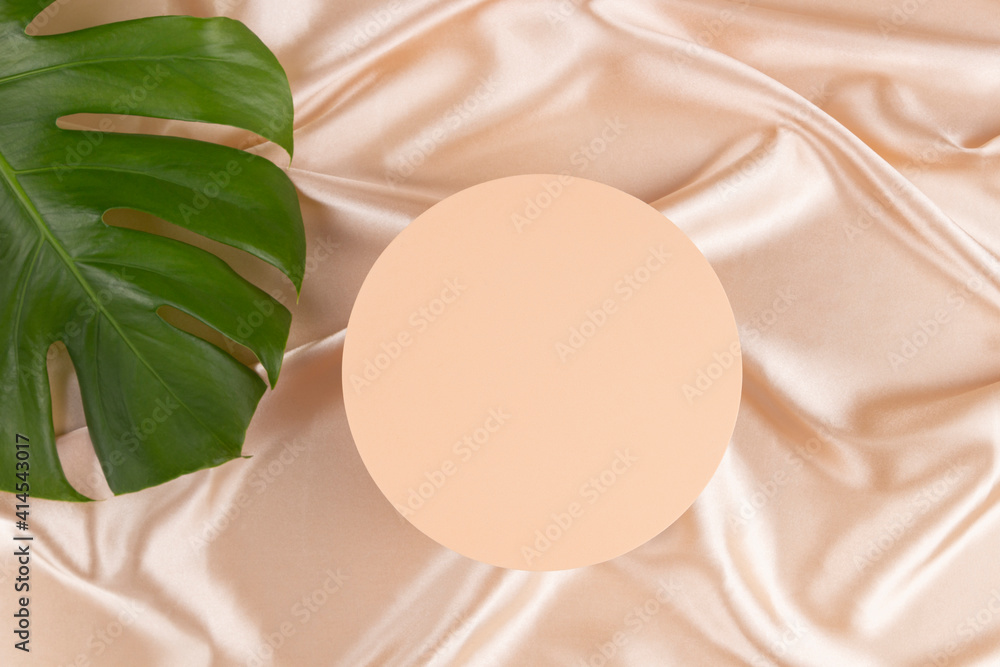 Geometric platform podium and monstera leaf on pastel silk satin background. Blank minimal round cylinder form mock up background for cosmetic product presentation. Top view
