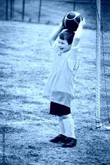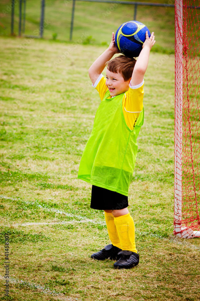 Young child boy playing soccer during organized league game