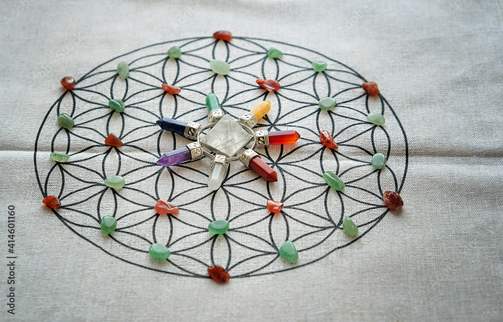 quartz crystals grid Altar Kit. Crystals Layout, gemstones Ritual. Healing minerals for Chakra Relaxation, Wiccan Witchcraft. life balance, esoteric, spiritual practice concept