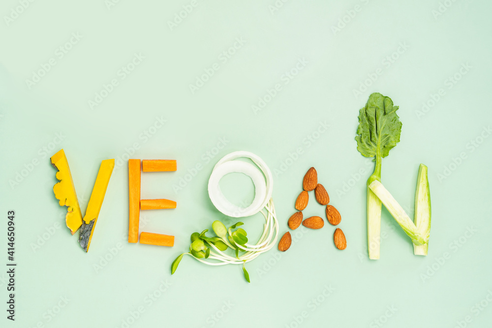 Flat lay picture for Vegan diets - beautiful and colorful variety of vegetables and nuts arranging into a word "VEGAN" on green background. Headline, Concept, Top view, Copy space, Product background