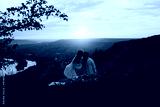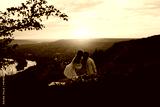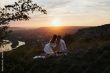 Happy young couple enjoying picnic on the hill. Sunset over hill in the background. Romance, dating and love concept.