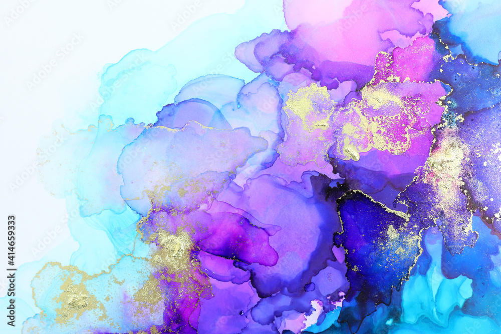 art photography of abstract fluid art painting with alcohol ink, blue, purple and gold colors
