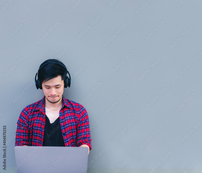 Happy young man working on laptop computer Young handsome freelancer sitting on floor free time with new modern laptop University international student guy in headphones and study online on laptop