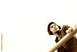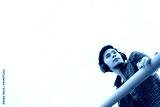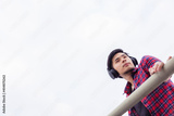 Portrait handsome asian guy Attractive handsome young man looking away with sky background copy space Cool guy wear headphones and red shirt Charming men get determined and confident He look smart