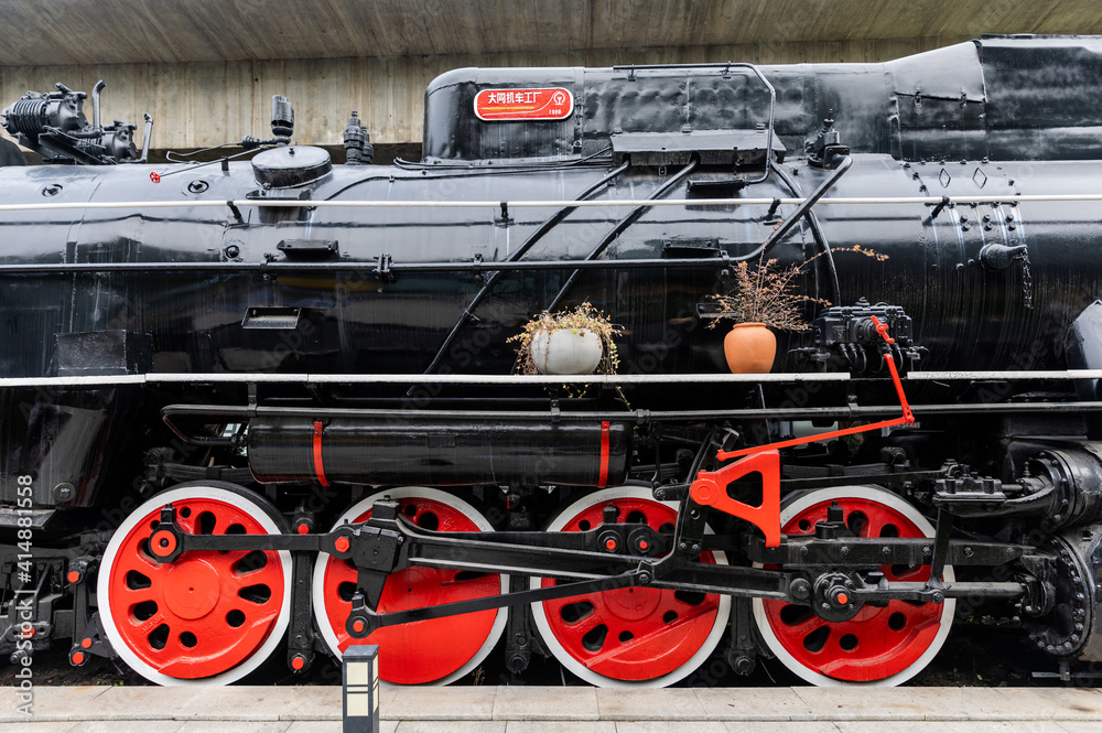 Engine of a historic, old stream locomotive at former site of Jiangwan Station of historic Woosong or Songhu Railway built in 1876 in Hongkou District, Shanghai, China.