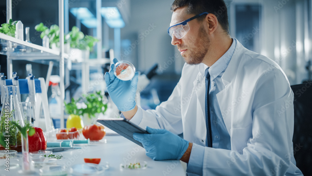 Male Microbiologist Working on Tablet Computer and Examining a Lab-Grown Vegan Meat Sample. Medical Scientist Working on Plant-Based Beef Substitute for Vegetarians in Modern Food Science Laboratory.