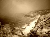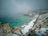 A snow storm covered the seashore. Bright turquoise sea, squally wind, huge waves, bright sun. The concept of bad weather, cold, sudden arrival of winter. Cape Fiolent Sevastopol Crimea top view
