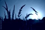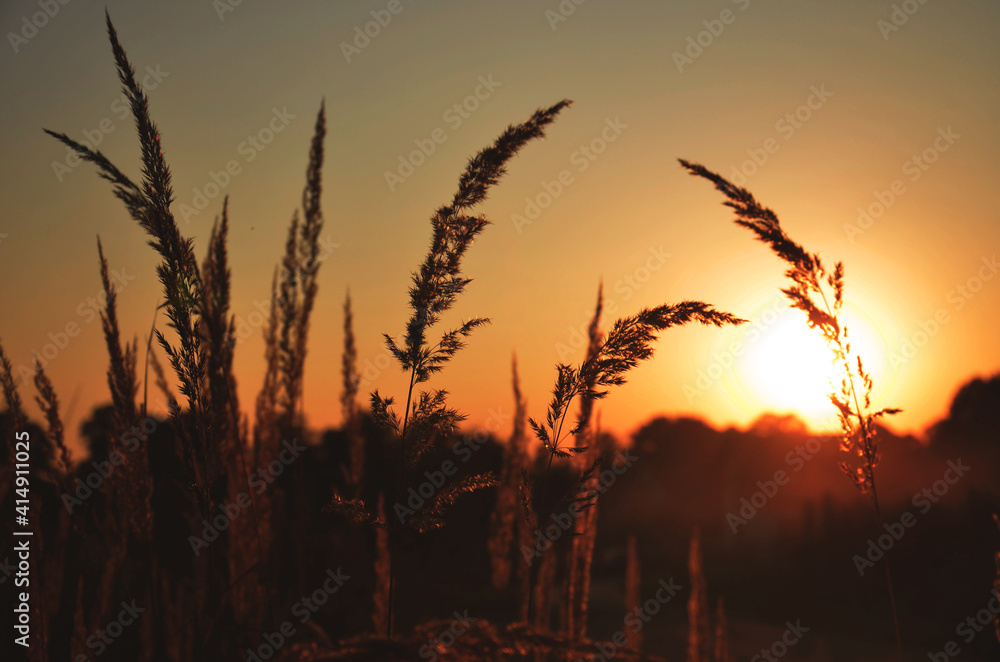 Sunset between plants on the field.