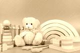 Teddy bear, wooden rainbow, educational and music baby toys on light blue background