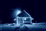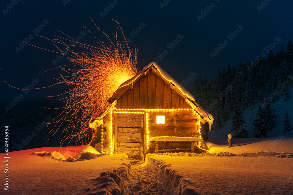 Fantastic winter landscape with glowing wooden cabin in snowy forest. Fire sparks fly out of the chimney. Christmas holiday concept