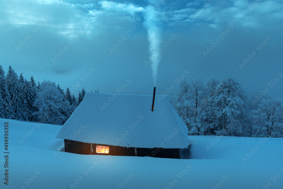Fantastic winter landscape with glowing wooden cabin in snowy forest. Cozy house in Carpathian mountains. Christmas holiday concept