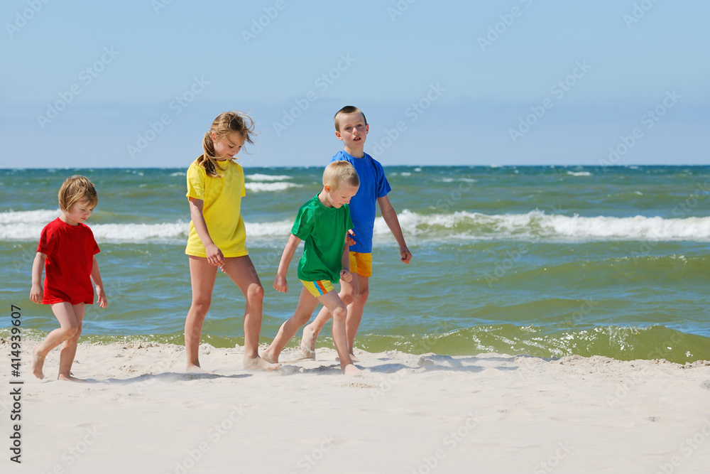 Two girls and two boys in colorful t-shirts walking on sandy beach