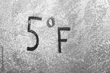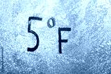 5 degrees Fahrenheit or -15 Celsius number lettering on icy glass covered with ice and frost. The concept of extreme cold weather