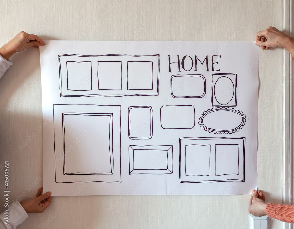 Woman evaluating and sizing up white poster with drawn set of different empty vertical and horizontal picture frames on white wall, planning family photo gallery project to capture moment, lifestyle