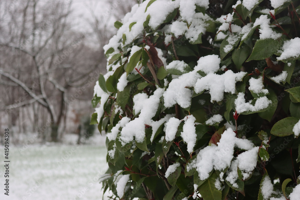 Red Robin Photinia hedge covered by snow on winter season. Photinia x fraseri in the garden