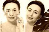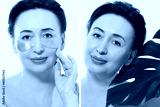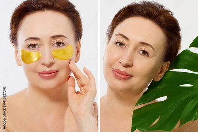 Macro female face before after beauty treatment. Before-after bags under eyes. Middle aged woman. Beauty portrait of middle age woman with wrinkles and a gold patch under eye isolated.