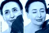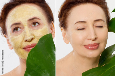 Middle age closeup woman face before after beauty mask treatment. Before-after wrinkled skin. Summer anti aging collagen mask on woman wrinkle face isolated. Mid aged facial skincare. Menopause period