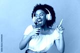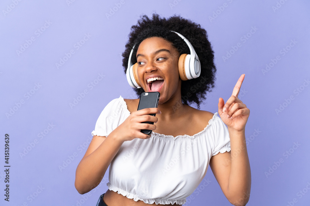 Young African American woman isolated on purple background listening music with a mobile and singing