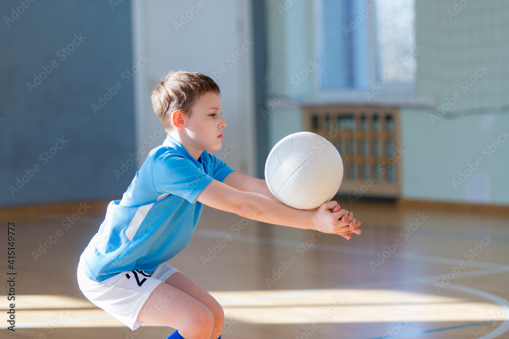 School kid playing volleyball in a physical education lesson. Safe back to school during pandemic concept