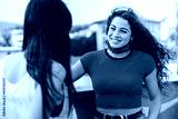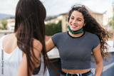 Two beautiful young women talk together on a summer's day wearing lowered protective face masks during the Coronavirus Covid-19 pandemic - Millennial girlfriends have fun and hang out on the weekend