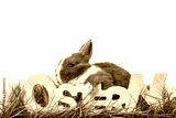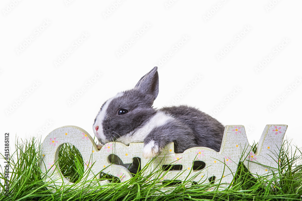Easter Card, white background with easter rabbit on green grassland with german word "Osterm" greeting card.