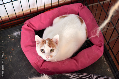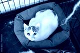 A cute white cat with ginger dots lying on a cat bed