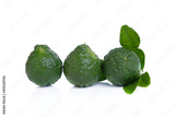 Bergamot fruit with cut in half and leaf isolated on white background.
