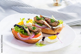 Sandwich - smorrebrod with sprats, avocado, tomatoes, eggs and cream cheese on white plate. Danish cuisine. Eco friendly concept.