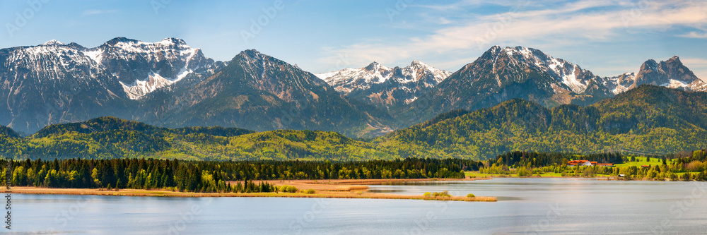 panoramic landscape with meadow and lake in Bavaria, Germany, at springtime