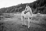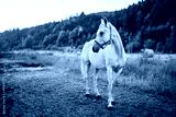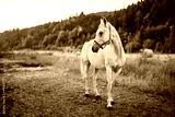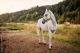White arabian horse standing on farm ground, blurred meadow and forest background