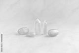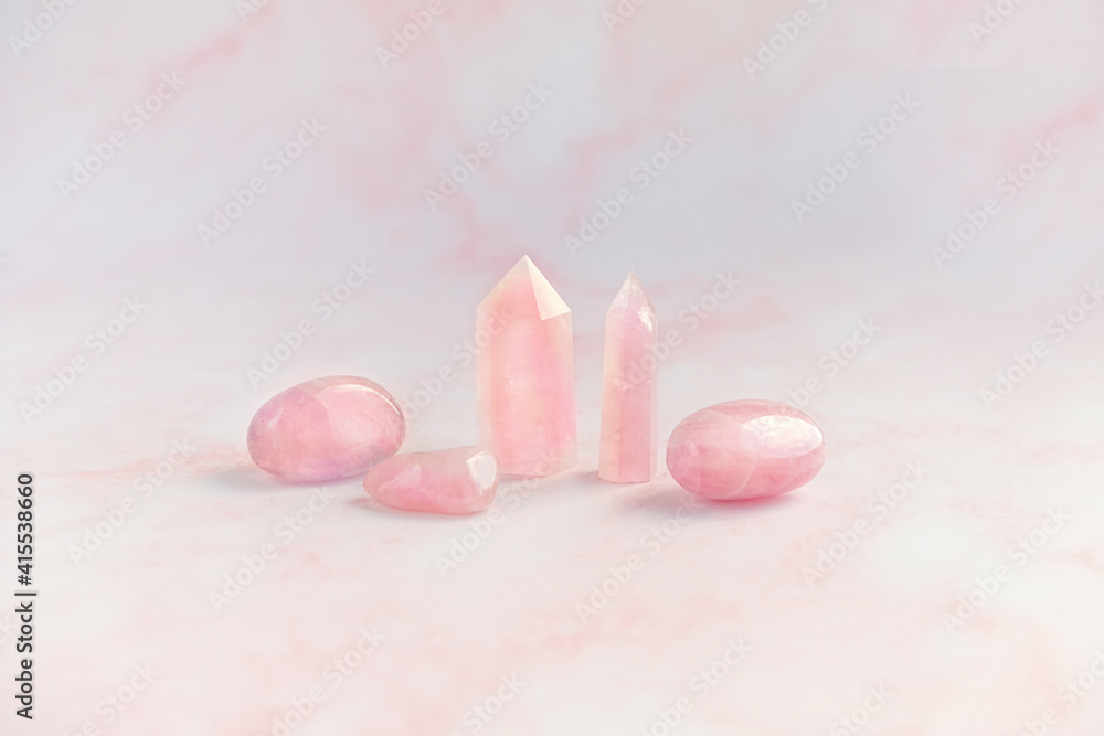 Pink quartz minerals set on abstract marble background. Healing minerals for Chakra Relaxation, Wiccan Witchcraft. life balance, esoteric, spiritual practice concept
