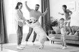 Cheerful family with kids and dog dancing at home
