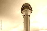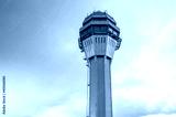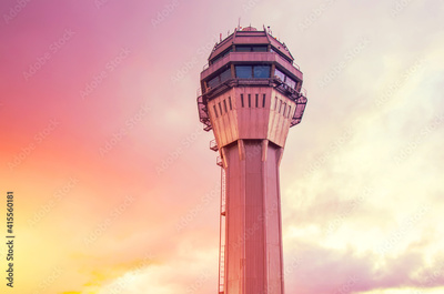 Airport traffic control tower lonely with background of the sunset orange pink light sky and clouds.