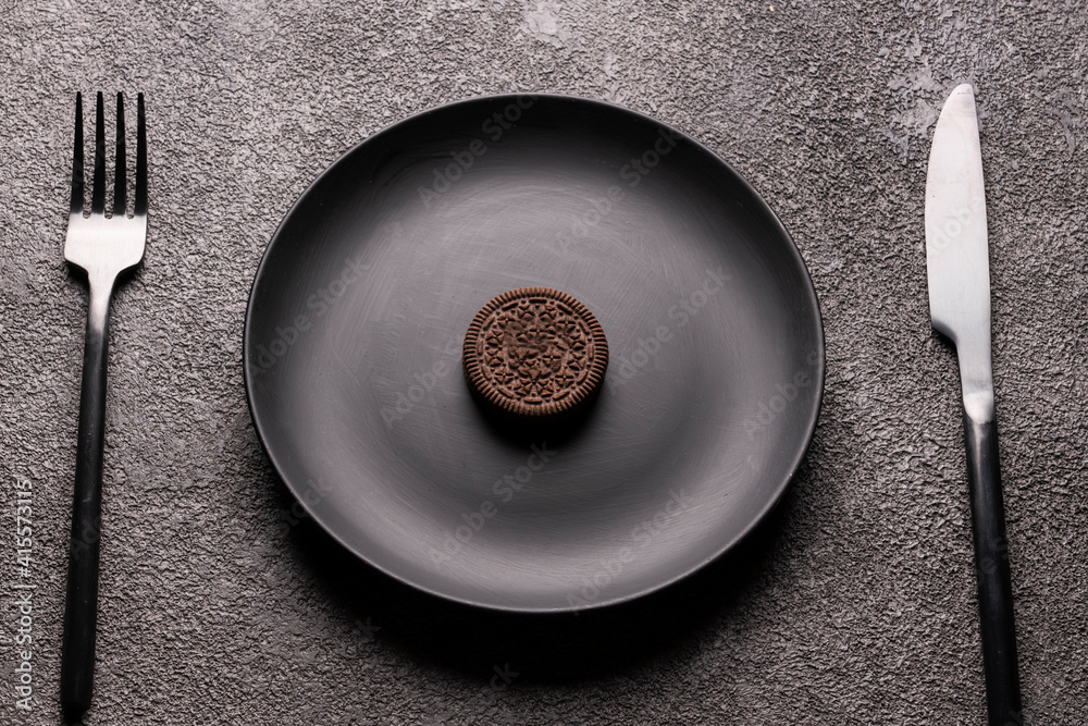 small cookies in a large black plate, cutlery, fork and spoon. A concept for the design of a restaurant, kitchen, or for an article about diet or desserts