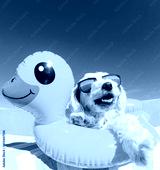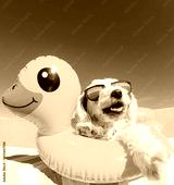 dog wit sunglasses and floating ring