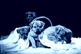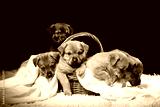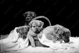 Group of puppies in a wicker basket on a white blanket. Studio photo on a black background.